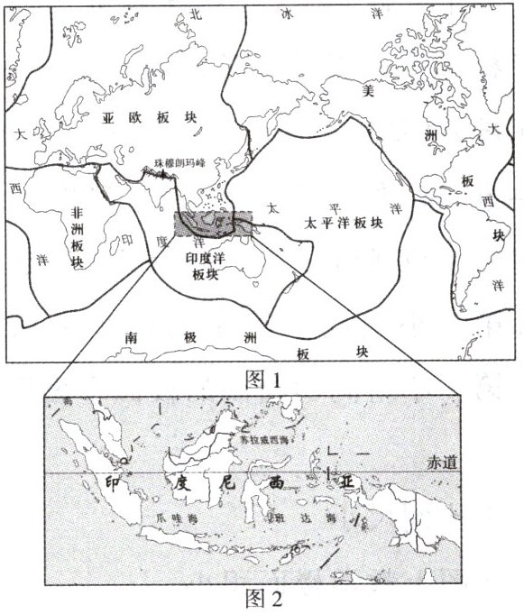 材料 下图为六大板块分布示意图(图1)和印度尼西亚区域示意图(图2)。