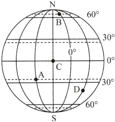 13. C 解析:读图可知,A点地理坐标为(23.5°S,60°W),位于西半球、低纬度、南半球;B点位于C点的东北方向;四点中,只有C点位于赤道上,全年昼夜平分;C点经度为30°W,B点经度为0°,D点经度为30°E,B、D两点位于东半球。14. D 解析:读图可知,A点地理坐标为(23.5°S,60°W),关于地心的对称点和A点经度和为180°,东西经相反,纬度数值相等,南北纬相反,所以A点关于地心的对称点地理坐标为(23.5°N,120°E)。