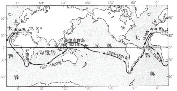 2024年是麦哲伦环球航行505周年。1519年,麦哲伦率领的船队从西班牙出发开始人类首次环球航行。1522年,船队成功返回西班牙。下图为麦哲伦船队环球航行路线图。读图,完成7~9题。