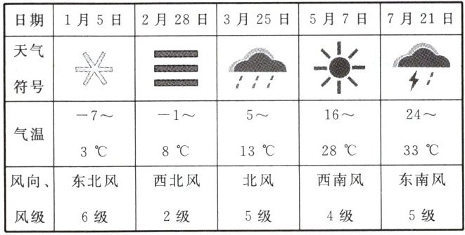 |气温|-7~3℃|-1~8℃|5~13℃|16~28℃|24~33℃|