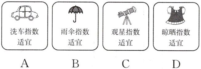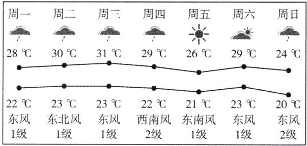 - [新考向·生活情境] 下图为某城市未来一周的天气预报示意图。读图,完成8~10题。