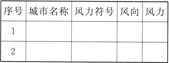 (1)在中央气象台网站查看实时风速图(下图)。找出任意两个城市,记录风力符号,并据此记录风向与风力。