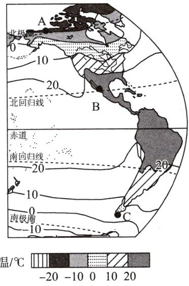 材料 某影片中,故事主人公们于阿拉斯加(A)会合,开始了他们的美洲穿越计划。他们从北极圈出发,一路向南,以阿根廷最南端(C)为目的地。下面为世界等温线分布局部图。