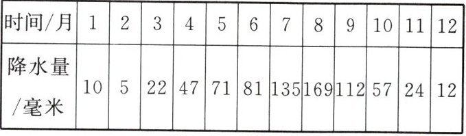|降水量/毫米|10|5|22|47|71|81|135|169|112|57|24|12|