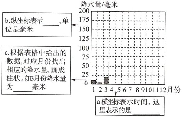 1. a. 月份 b. 降水量 c. 22 3. 该地一年中降水季节分配不均,夏季多雨,冬季少雨。