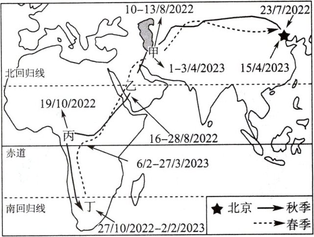 材料 雨燕是北京的夏候鸟,科研人员为北京雨燕装上光敏定位仪,根据定位仪所获取的数据,绘制了 2022~2023 年北京雨燕迁徙线路图。