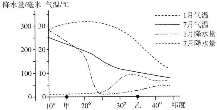 13. D 解析:读图可知,甲地 1 月降水多,7 月降水少,降水量季节变化大,而乙地 1 月和 7 月降水量都不多,因此甲地降水量季节变化比乙地大。甲地 1 月气温约为 30°C,7 月气温约为 22°C,气温年较差为 30°C - 22°C = 8°C;乙地 1 月气温约为 25°C,7 月气温约为 12°C,气温年较差为 25°C - 12°C = 13°C,甲地气温年较差比乙地小。图示地区 1 月气温高于 7 月气温,该地区位于南半球,1 月降水量北多南少。