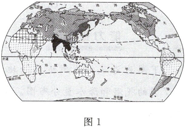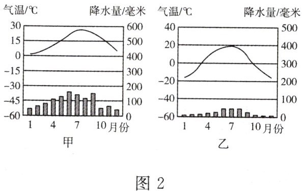(3)图2所示两种气候类型中,适宜种植水稻的是____(填“甲”或“乙”),该气候类型位于图1中的____(填字母)地。
