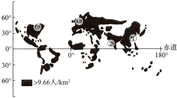 为了揭示世界人口的分布状况,著名学者邦奇等创建了人类大陆图。在地图上取消陆地和海洋,仅画出人类密集的地区,面积较大的人类密集区称人类大陆。世界上共存在四个人类大陆:第一个为东亚和东南亚;第二个是南亚;第三个是欧洲;第四个是北美东部。下图是人类大陆图。根据材料,探究下列问题。