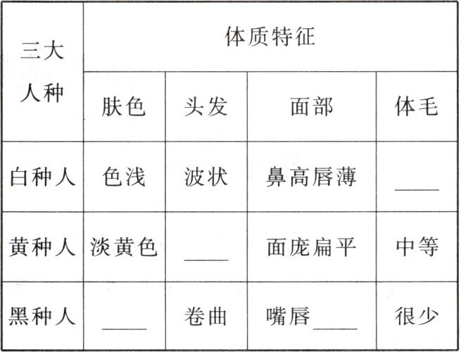 2. 人种的分布和地位:同一人种在世界上既有大范围的______分布区,又有小范围的______分布。不同人种虽然有体质上的差异,但没有优劣之分,所有人种都是______的。