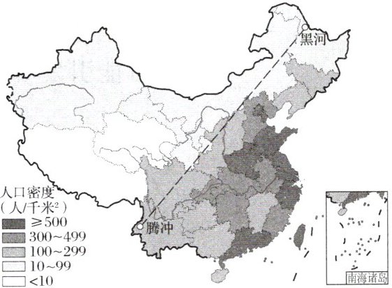 6.D [我国人口的分布特点是黑河—腾冲一线以东人口稠密,以西人口稀疏;内陆人口稀疏,沿海人口稠密;山区人口稀疏,平原人口稠密。] 7.C [据图示中图例符号可以确定,我国人口密度小于10人/平方千米的省级行政区是青海省和西藏自治区。] 8.D