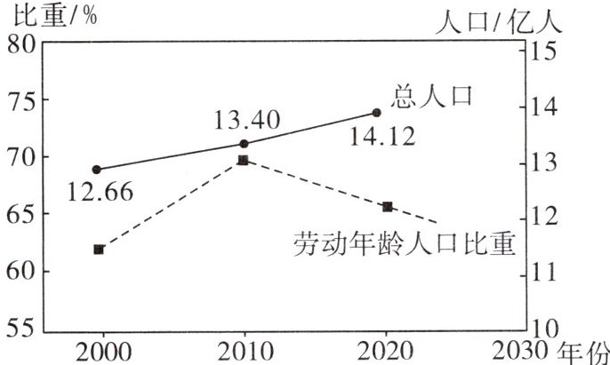劳动人口是指具有劳动能力的适龄人口(16~59 岁)。下图是 2000 年以来我国总人口及劳动年龄人口占总人口(不含港、澳、台)的比重变化趋势图,据此完成 9~10 题。