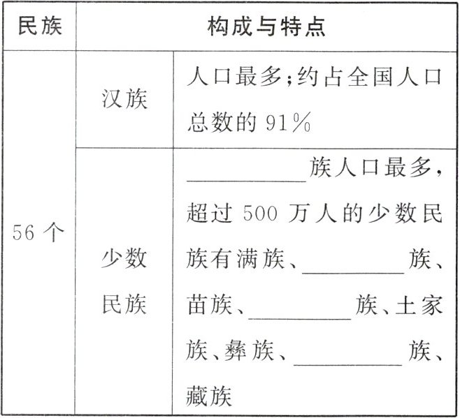|56个|汉族:人口最多;约占全国人口总数的91%