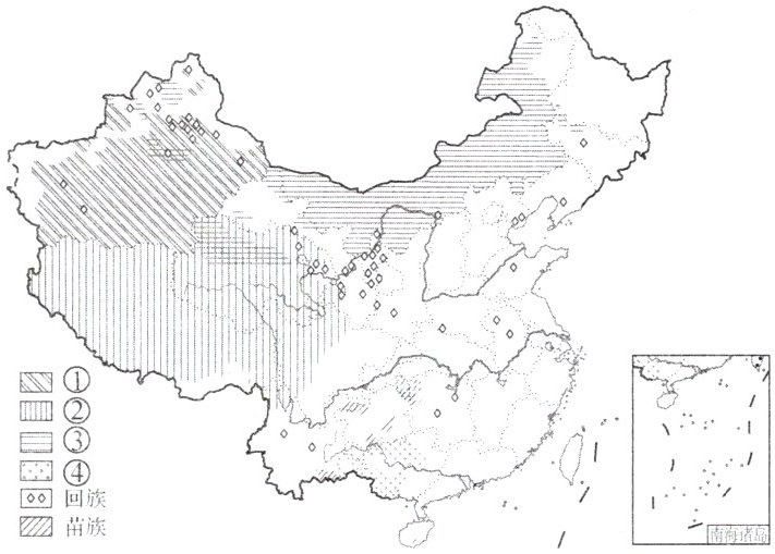 4.D [从图中可以看出,①是宁夏回族自治区,②是甘肃省,③是云南省,④是广西壮族自治区。我国人口最多的少数民族是壮族,主要分布在广西壮族自治区。] 5.A [我国少数民族主要分布在西南、西北和东北地区,A错误。]
