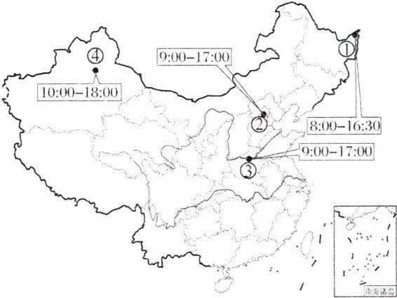 3. 图中①②③④四地邮局营业时间存在差异的主要原因是(
