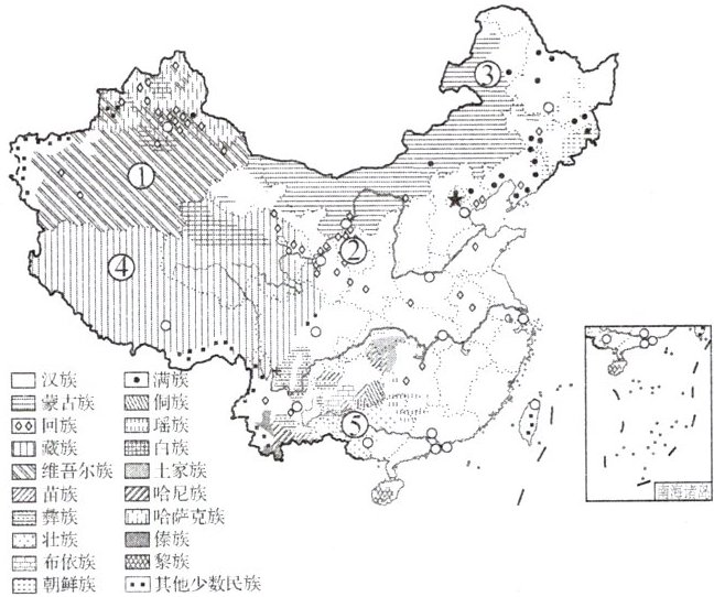 23. (20 分)56 个民族组成了统一和谐的中华民族大家庭。读我国民族分布图,完成下列问题。