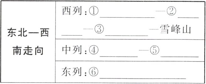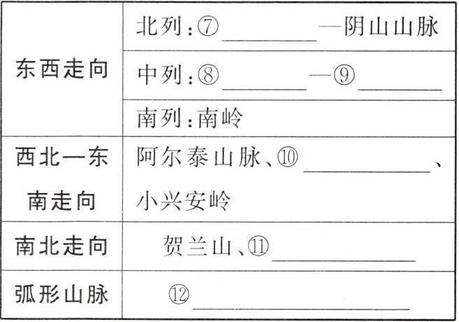 ①大兴安岭 ②太行山脉 ③巫山 ④长白山脉 ⑤武夷山脉 ⑥台湾山脉 ⑦天山山脉 ⑧昆仑山脉 ⑨秦岭 ⑩祁连山脉 ⑪横断山脉 ⑫喜马拉雅山脉