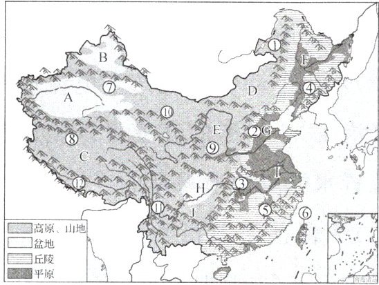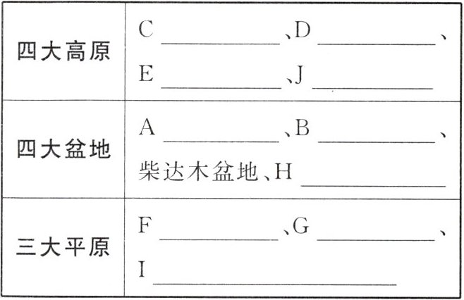 四大高原:C青藏高原、D内蒙古高原、E黄土高原、J云贵高原;四大盆地:A塔里木盆地、B准噶尔盆地、H四川盆地;三大平原:F东北平原、G华北平原、I长江中下游平原