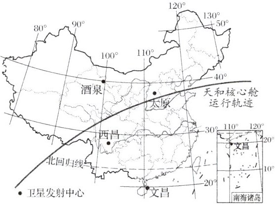 2021年10月16日,神舟十三号载人飞船成功对接我国第一个空间站核心舱“天和”。下图是我国空间站天和核心舱某时刻过境我国的轨迹示意图。读图,完成7~8题。