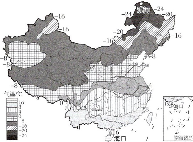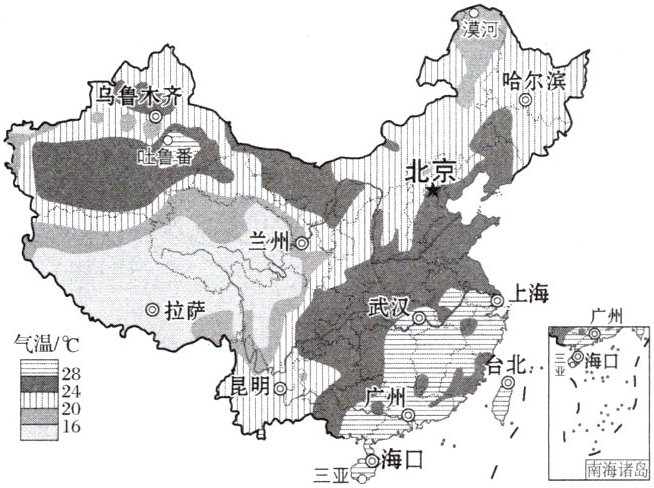 线分布。(2) 我国夏季气温的分布(以7月为例)