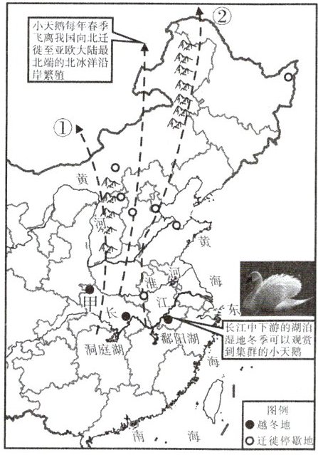 12.C [迁徙路线②经过了我国长江中下游平原、华北平原和东北平原,没有经过黄土高原。] 13.B [甲地位于秦岭以南,受秦岭的阻挡,冬季风难以下南,气温较高,适合作为小天鹅的栖息地。] 14.