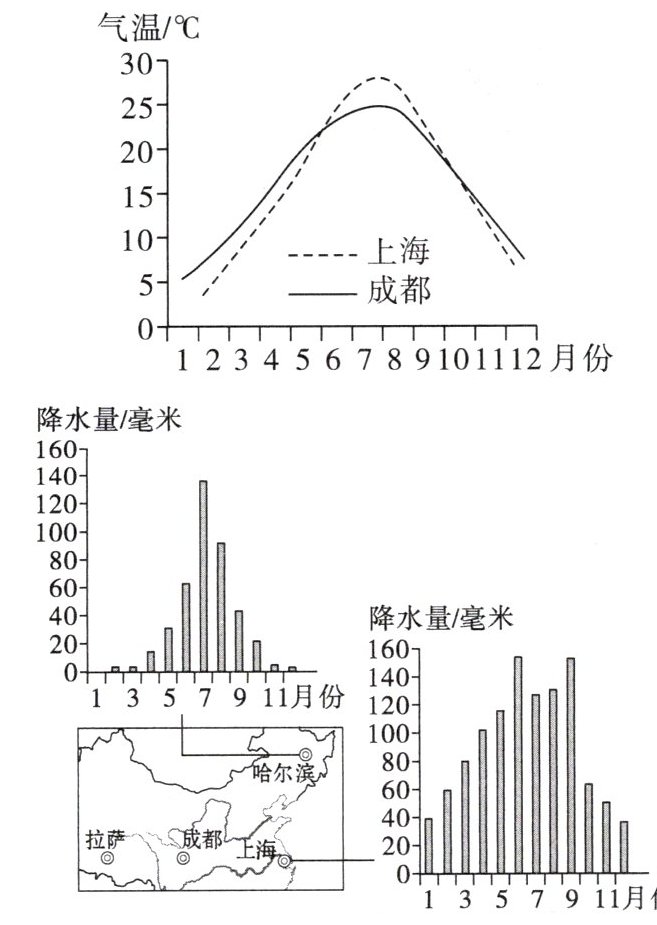 (4) 成都与上海纬度相近,但成都的冬季温度比上海高,请分析其原因。