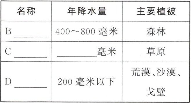 (1)干湿程度的空间差异 (2)湿润区 森林 半湿润区 半干旱区 200—400 干旱区