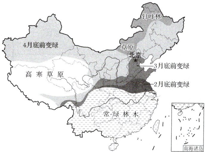 在北方,“一树繁花是春,枝头绿叶亦是春”。下图为中国天气网推出的全国树叶变绿进程预估示意图。据此完成4~5题。
