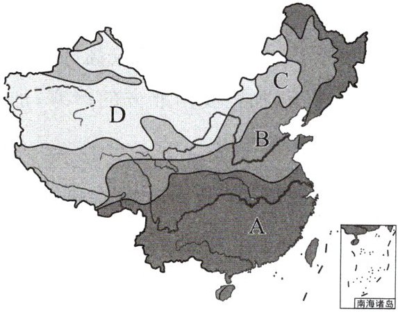 D.D是干旱区,年降水量在200毫米以下,沙漠广布