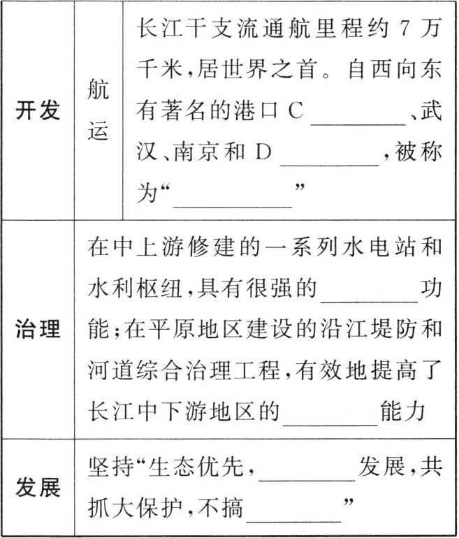 | |航运|长江干支流通航里程约 7 万千米,居世界之首。自西向东有著名的港口 C