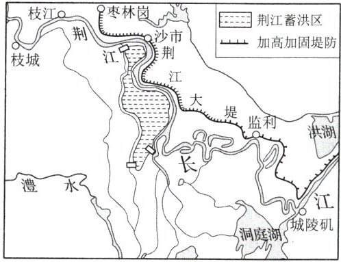荆江是指从湖北枝城到湖南城陵矶河段,此河段河道弯曲,水流不畅,易发生洪涝灾害。读图,完成 11~12 题。