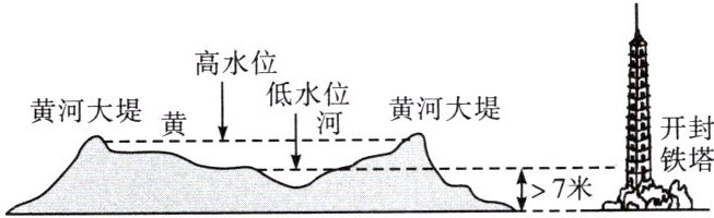 地上河指当河床海拔高于该河段流经地区的两岸地面形成的河流,由于水往低处流,水流方向全靠两岸人工修建的河堤约束。世界最著名的地上河是黄河下游。读黄河“地上河”示意图,根据所学知识,完成5~6题。
