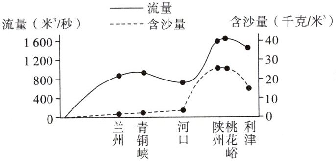 黄河哺育了灿烂的中华文明。多年来,黄河流域始终坚持生态优先、绿色发展,生态环境持续变好。读黄河流量、含沙量变化图,完成9~10题。