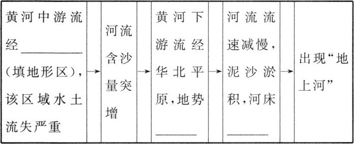 (填地形区),该区域水土流失严重|→河流含沙量突增|→黄河下游流经华北平原,地势低平