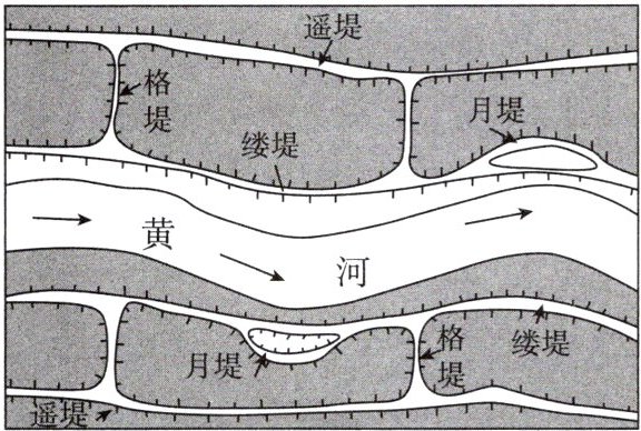 明代著名黄河治理专家潘季驯认为“筑堤束水,以水攻沙,水不奔溢于两旁,则必直刷乎河底”。他认为除堵决口外,以主要力量在黄河下游的河道两岸,紧逼水滨,建筑坚固的堤防。这两道南北大堤被称为近堤或缕堤,是束水攻沙的最主要工程。不过由于南北两堤逼水太近,即使建得非常坚固,如遇特大洪水,黄河也会溃堤泛滥,酿成洪灾。为了防范,他们又在南北缕堤之外,再各筑一道远堤,又称遥堤。这种近、远双重的河堤,普遍修建于黄河下游(接近海口的河段除外),其中的某些险要河段,于近、远堤外,又建有月堤加固(如下图所示)。