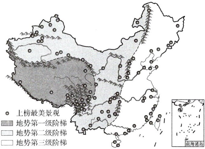 《中国国家地理》杂志在“选美中国”的景观评比中,选出了一批中国最美景观,如最美山峰、最美湖泊、最美森林、最美草原……当把这些最美景观标注在地图上后,发现中国的美景有很多集中分布在中国地势三大阶梯的转换处(也就是在阶梯界线附近)。下图为我国地势三级阶梯及上榜最美景观分布图。