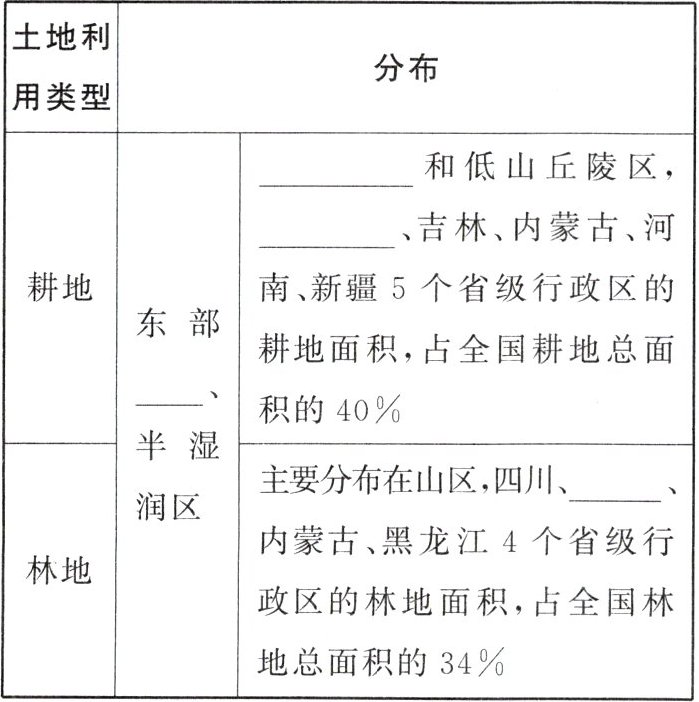 、吉林、内蒙古、河南、新疆5个省级行政区的耕地面积,占全国耕地总面积的40%||林地|主要分布在山区,四川、