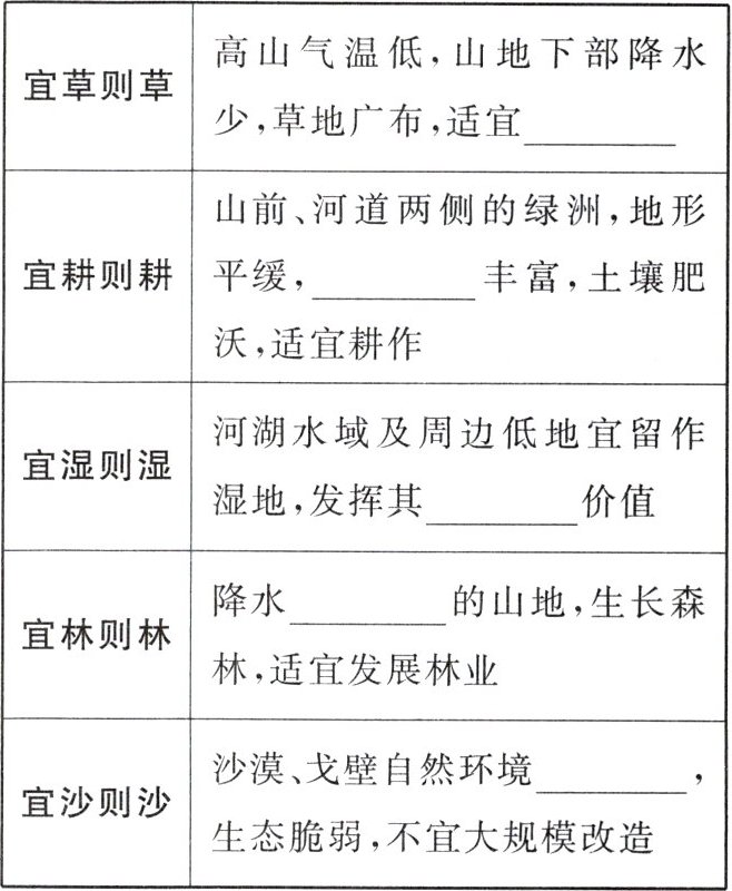 的山地,生长森林,适宜发展林业||宜沙则沙|沙漠、戈壁自然环境