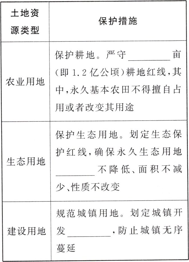 亩(即1.2亿公顷)耕地红线,其中,永久基本农田不得擅自占用或者改变其用途||生态用地|保护生态用地。划定生态保护红线,确保永久生态用地
