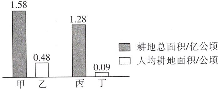 中国陆地面积略多于美国,耕地总面积却少于美国,人均耕地面积更少于美国。读中国、美国耕地总面积和人均耕地面积比较图,完成4~5题。