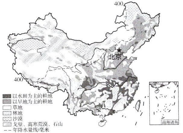 2024年,全国土地日主题为“节约集约用地,严守耕地红线”。读我国土地利用类型分布图,完成6~7题。