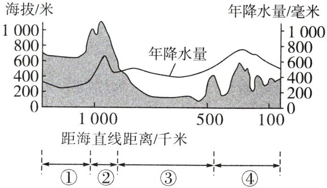 19. 下图为我国中温带某地的地形剖面及年降水量曲线图。①②③④四个区域的土地资源按利用类型分,依次为(