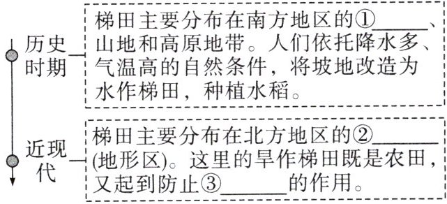(1)丘陵 黄土高原 水土流失(2)原因:梯田不利于开展大规模机械化耕作,水利设施落后,灌溉条件较差;进城务工人员增多,农村劳动力短缺。建议:利用梯田景观发展旅游业;退耕还林、还草,恢复生态保护功能。(3)珍惜和合理利用耕地,保护优质耕地;提高耕地质量,增加优质产田面积。