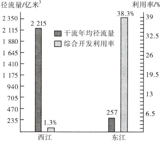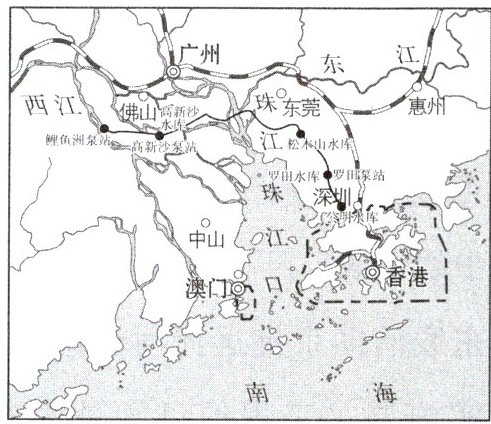 珠江三角洲水资源配置工程西起西江干流鲤鱼洲,东至深圳公明水库,全线采用深埋管道输水方式。项目建成后,将解决广州、深圳、东莞等地生产生活缺水问题,并为香港等地提供应急备用水源,为粤港澳大湾区发展提供战略支撑。读珠江三角洲水资源配置工程线路示意图和东江、西江水资源对比图,完成13~15题。