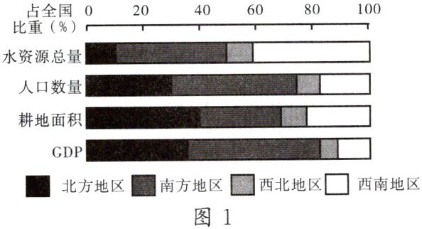 水是生命之源,人类可利用的水资源是非常有限的,我们通常所说的水资源是地球上可供人类使用的淡水,而我国又是一个水土资源空间匹配欠佳的国家,不同地区差异较大。下图为我国水资源、人口、耕地和国内生产总值(GDP)区域比重图(图1)及漫画(图2)。