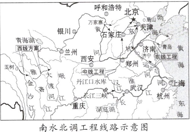 (1)跨流域调水是解决水资源地区分布不均的有效办法之一。东线:从长江下游扬州引水,利用