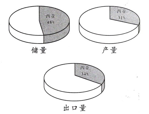 石油被称为“工业的血液”,是当今世界不可或缺的能源矿产和化工原料。世界石油资源的供需极不平衡。西亚的石油资源在世界能源市场中占有重要地位。下图为西亚石油储量、产量和出口量占世界的比重图(2020 年)。