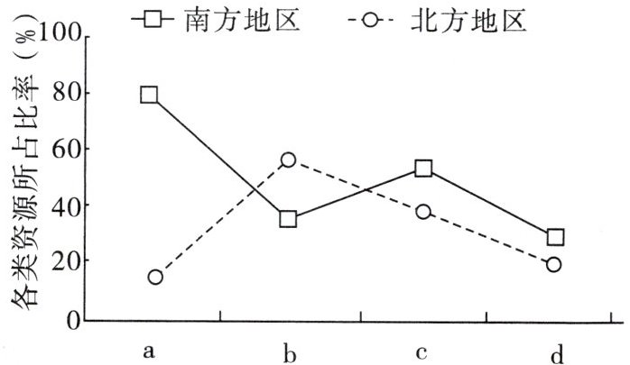 7.A [读图分析可知,a南多北少,南北相差很大,应为水资源总量;b南少北多而且相差不大,应为耕地面积;c是南多北少,相差不大,是人口数量;d南多北少,比重都较小且相差不大,是土地面积。]