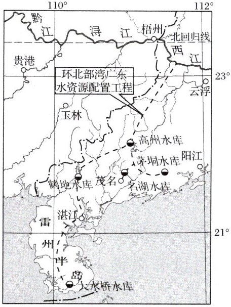 环北部湾广东水资源配置工程计划从西江干流取水,通过泵站加压提水,穿过云开大山,调水至雷州半岛,输水线路约500千米,覆盖人口超过1800万人。据此完成8~9题。