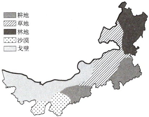下图为我国内蒙古自治区土地利用类型分布图,据此完成16~18题。